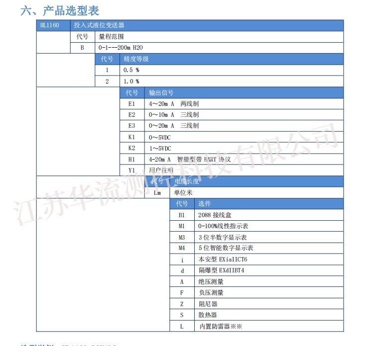 HL1160 投入式液位變送器(液體靜壓式,用于普通液體)采用高性能的擴散硅壓阻式壓力傳感器作為測量元件,經(jīng)過高可靠性的放大處理電路及精密溫度補償,將被測介質的表壓或絕壓轉換為標準的電壓或電流信號。本產(chǎn)品體積小巧,使用安裝方便,直接投入水中即可測量出變送器末端到液面的液位高度。